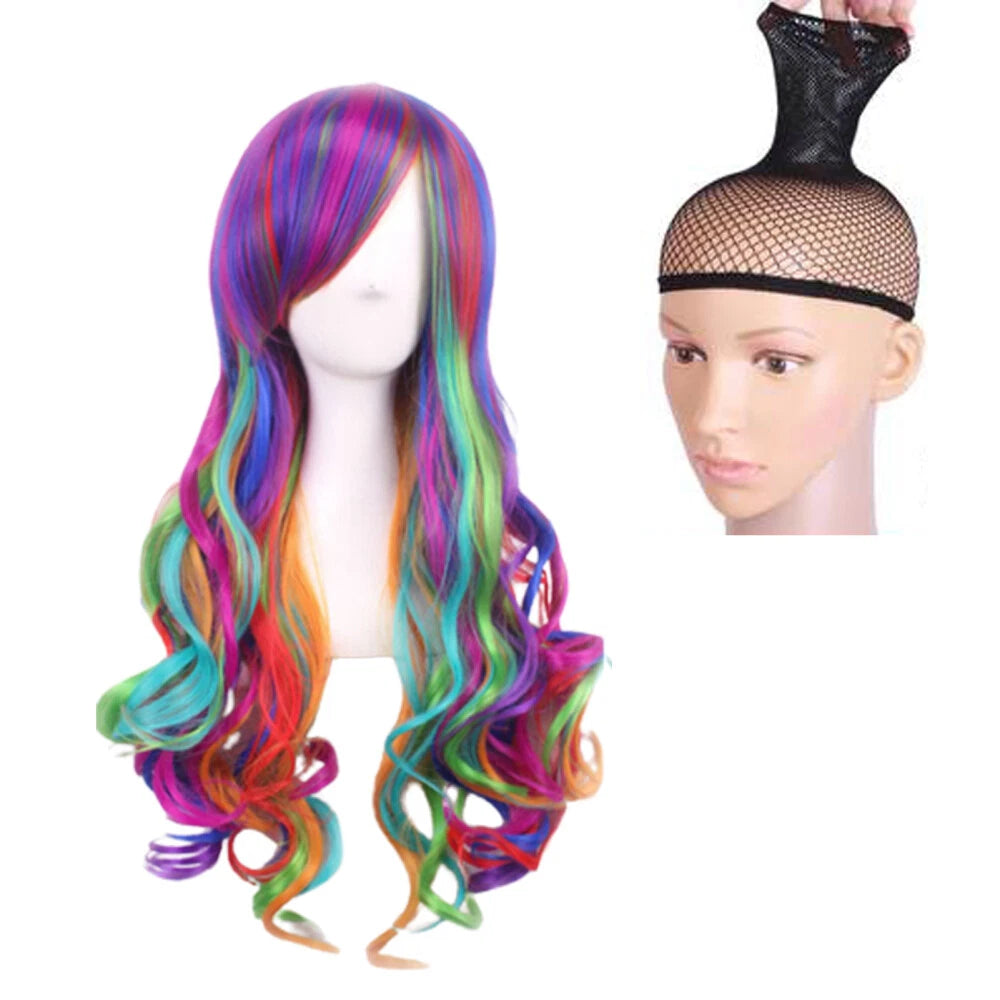 RAINBOW CURLY COSPLAY WIG: Add vibrant style with this Long Wavy Wig, designed in multi-colour rainbow tones. Perfect for costume parties, cosplay, and themed events, it delivers eye-catching flair with comfortable wear.