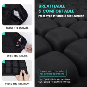 ERGONOMIC & COMFORTABLE: The Inflatable Travel Cushion provides enhanced comfort and support, perfect for wheelchairs, office chairs, and car seats. Designed to reduce pressure on your tailbone and hips, it is ideal for long hours of sitting. Portable and easy to use, this cushion is a must-have for anyone seeking relief from discomfort during extended seating.