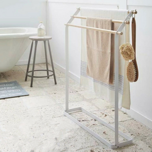Upgrade your bathroom with the Towel Hanger! This freestanding rack combines functionality with modern design, offering a sleek and space-saving solution for storing and drying bath towels. Crafted from metal steel and wood, it seamlessly integrates into your home decor