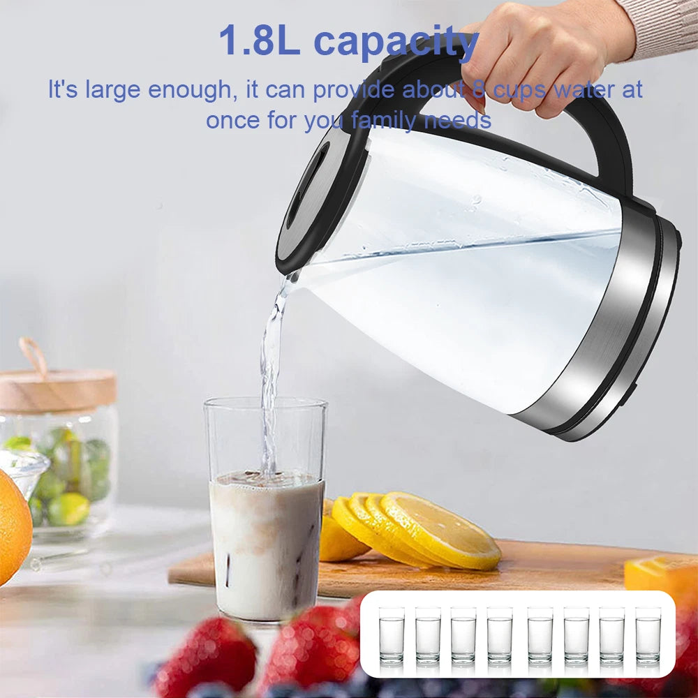 360° Rotation Kitchen Water Jug Stainless Steel LED Light Glass Kettle