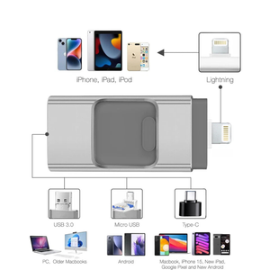 4-IN-1 FLASH DRIVE 2TB: Simplify your storage and file transfer needs with this innovative 4-in-1 USB Flash Drive. Designed for maximum compatibility, it features Lightning, USB 3.0, USB-C, and Micro USB connectors .