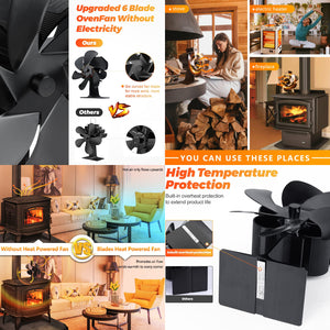 6 Blades Fireplace Fan Heat Self-Powered Wood Stove Top Burner Silent Eco Heater
