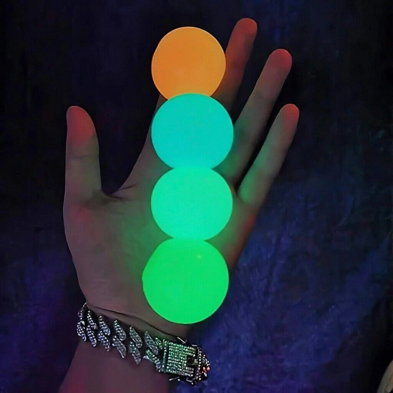 GLOW-IN-THE-DARK STICKY BALLS: Set of 12 fun and safe rubber balls that glow in the dark, stick to ceilings, walls, and floors, and provide endless stress-relief and entertainment for kids and adults alike.