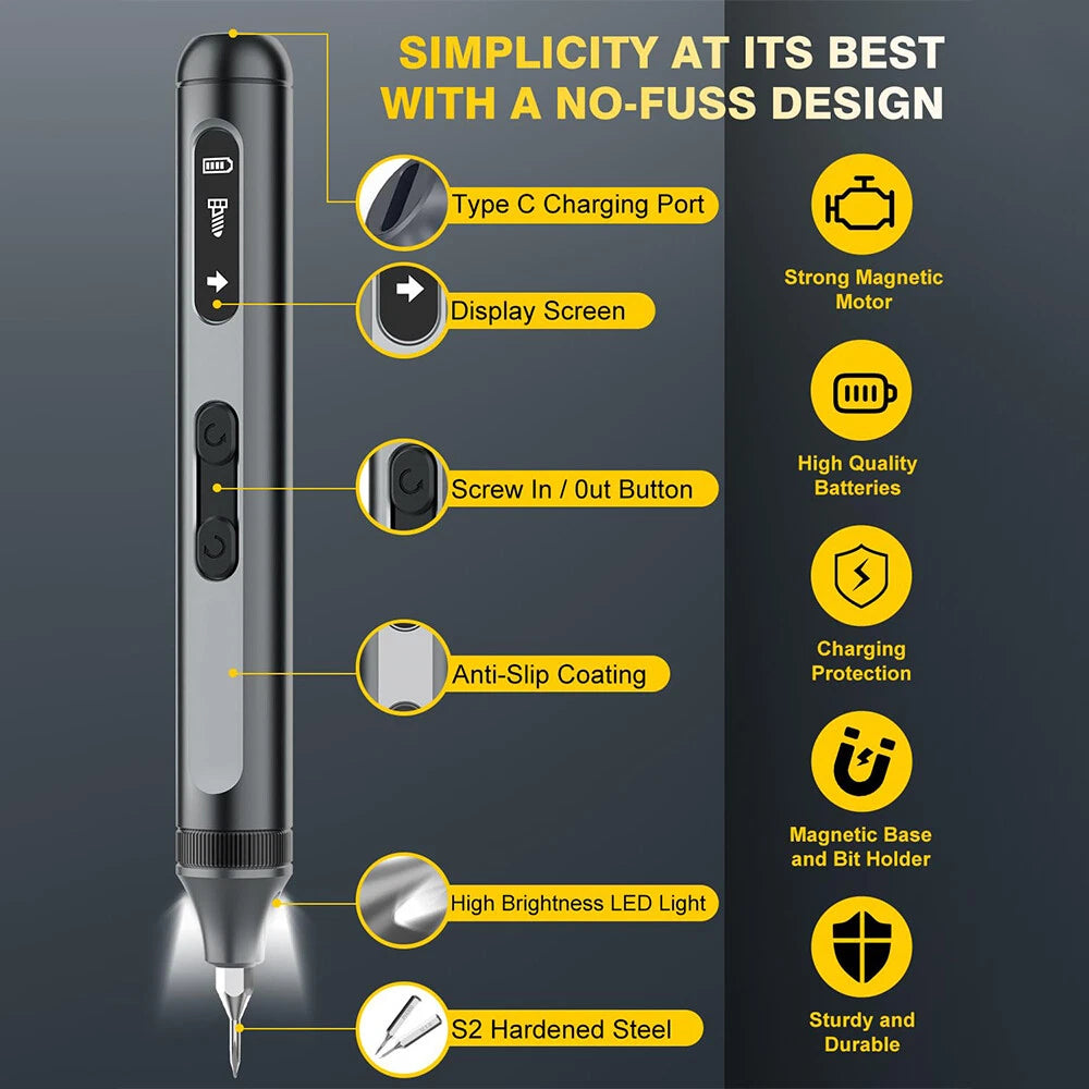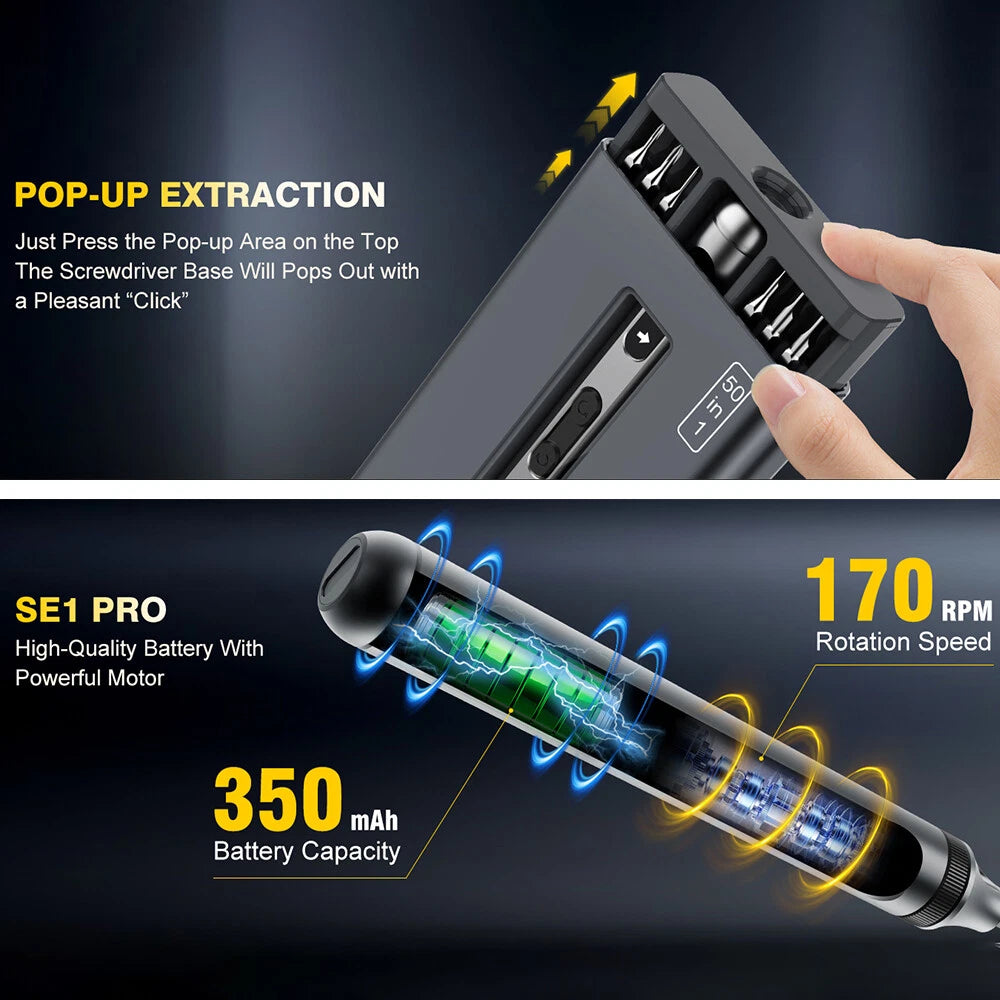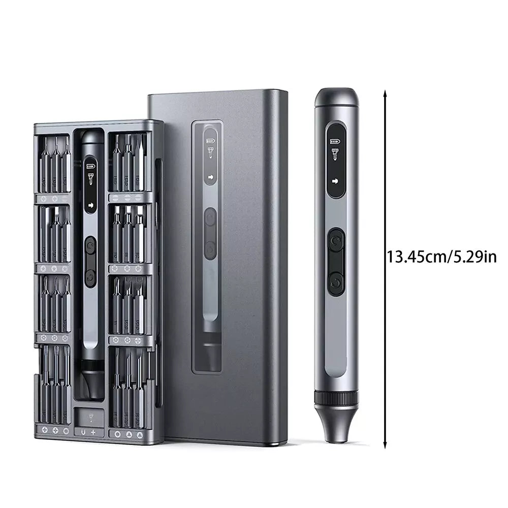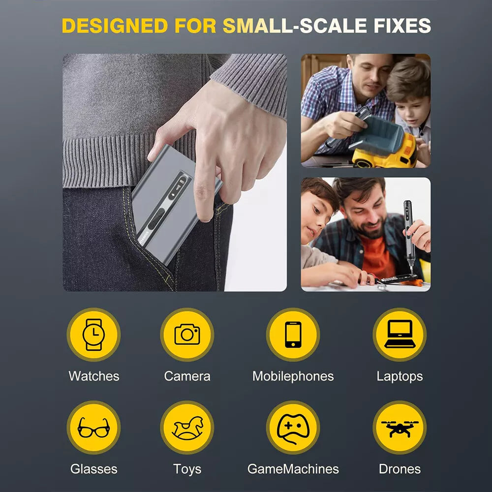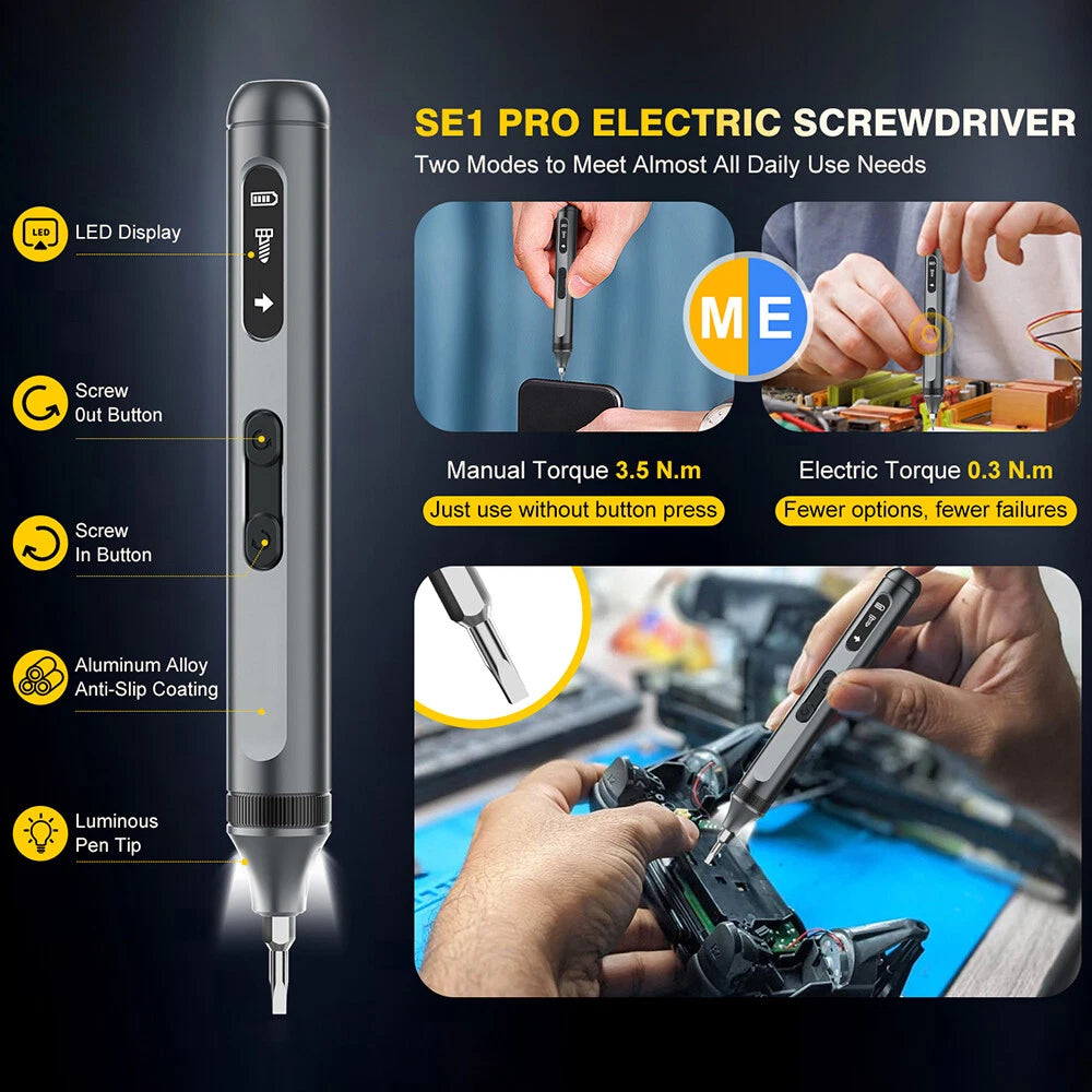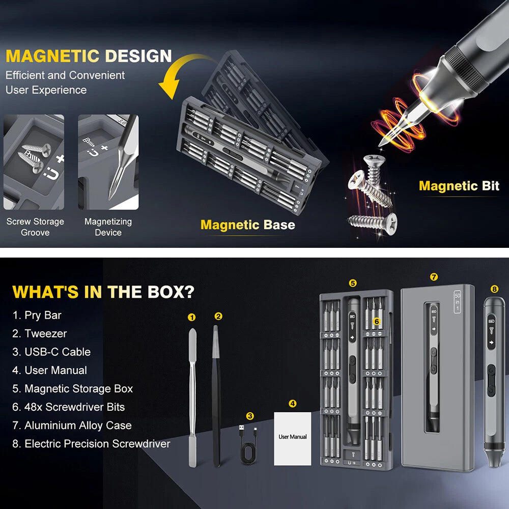 PRECISE & POWERFUL: This 50-in-1 Mini Electric Screwdriver Kit is perfect for electronics repair with 48 magnetic bits, dual torque modes, and a compact aluminium design. Built-in LED enhances visibility during precision tasks.