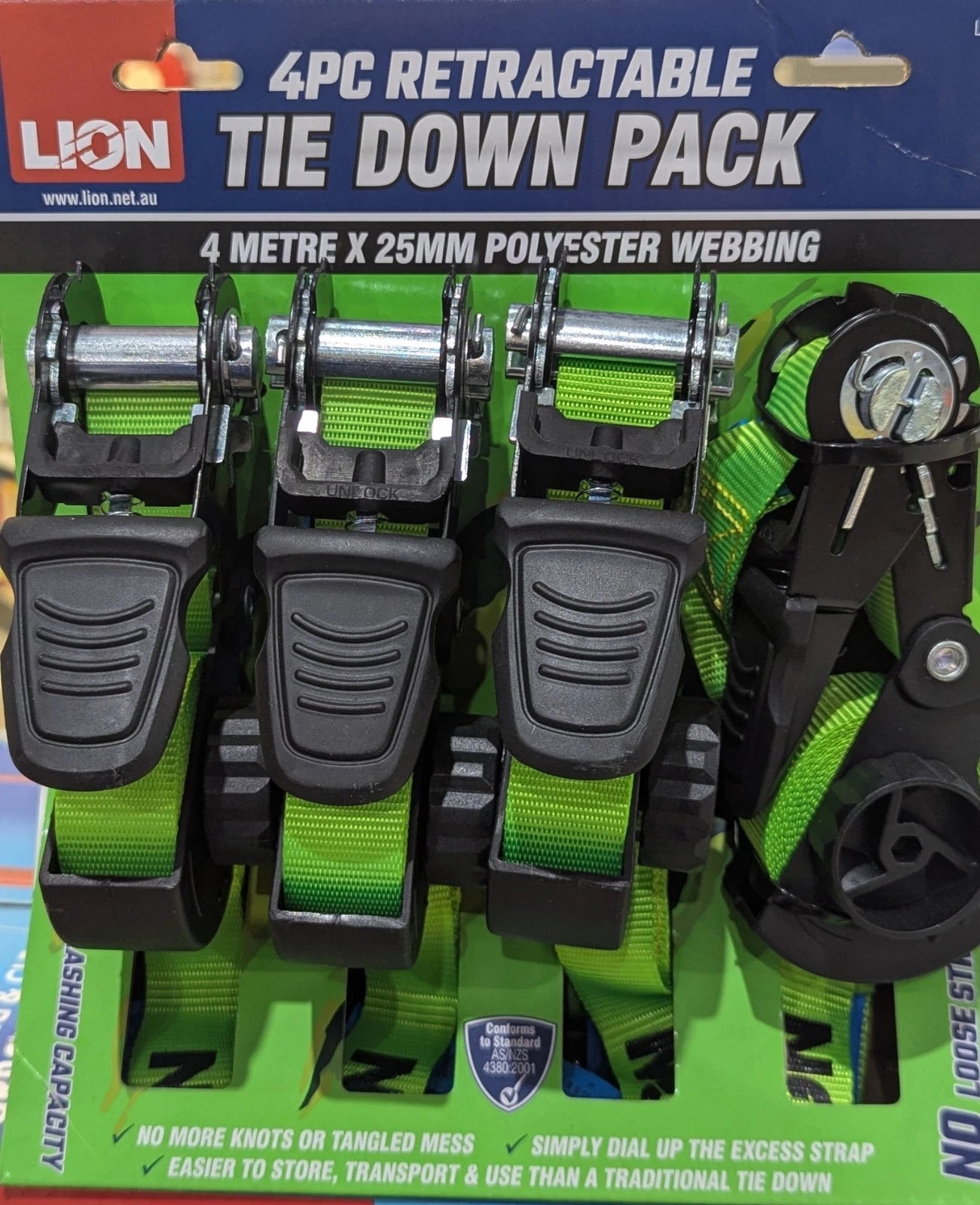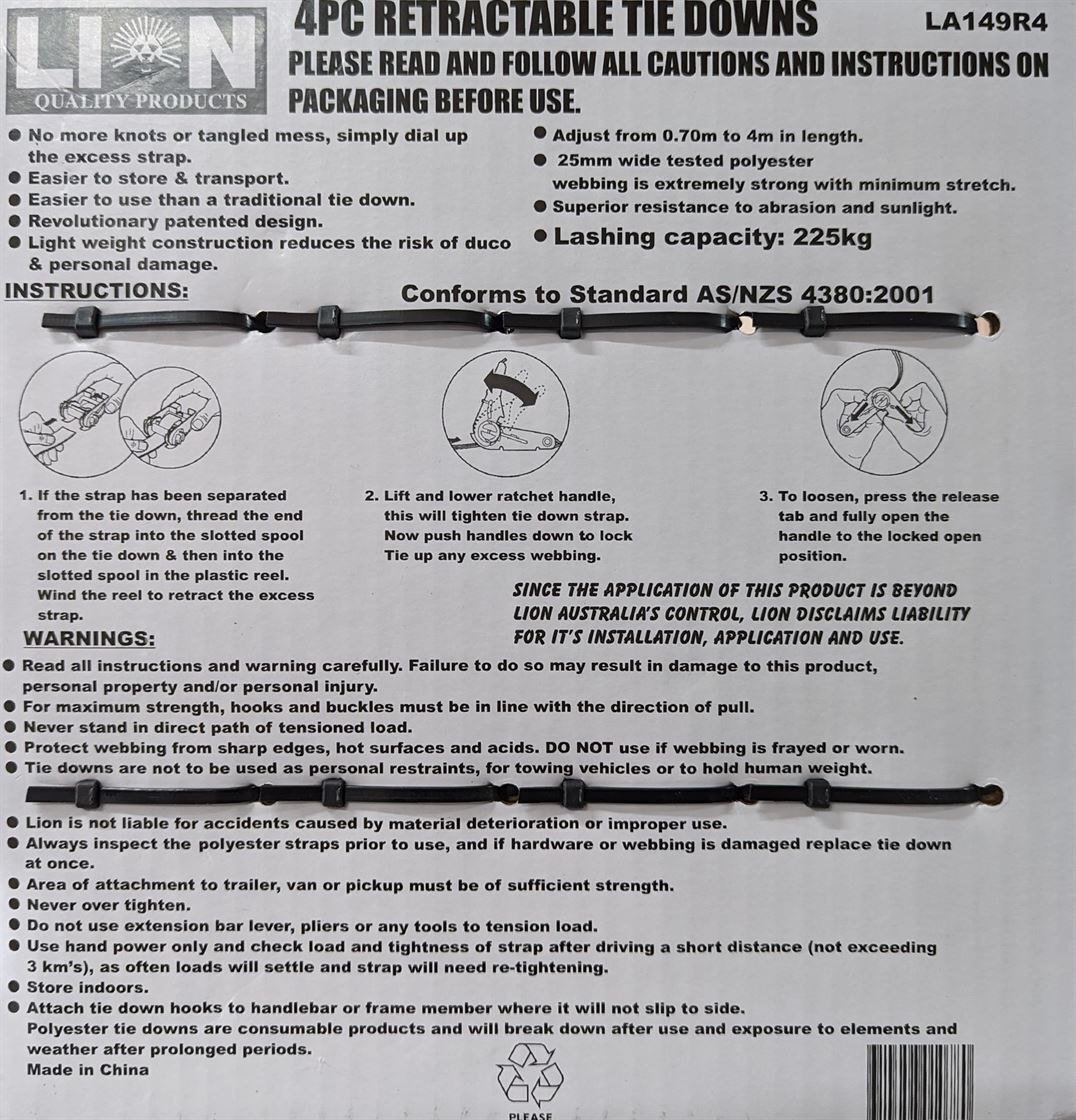 1x 4 Pack L/C 225KG 4m Tie Down Straps retracting wheel