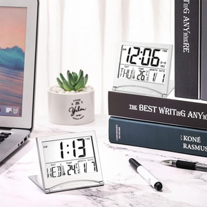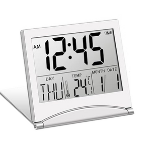 Silver Alarm Clock Desk Calendar Thermometer Timer Digital LCD Screen Travel