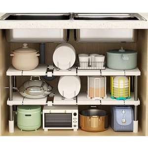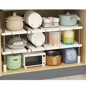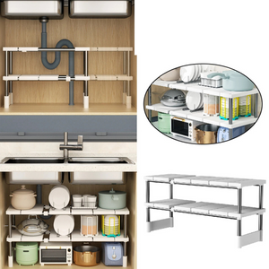 EXPANDABLE KITCHEN SHELF ORGANIZER: Maximise storage space with this versatile double layer shelf. Designed to fit under cabinets or inside cupboards, its adjustable width and durable construction make it ideal for pots, pans, utensils and small appliances.