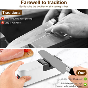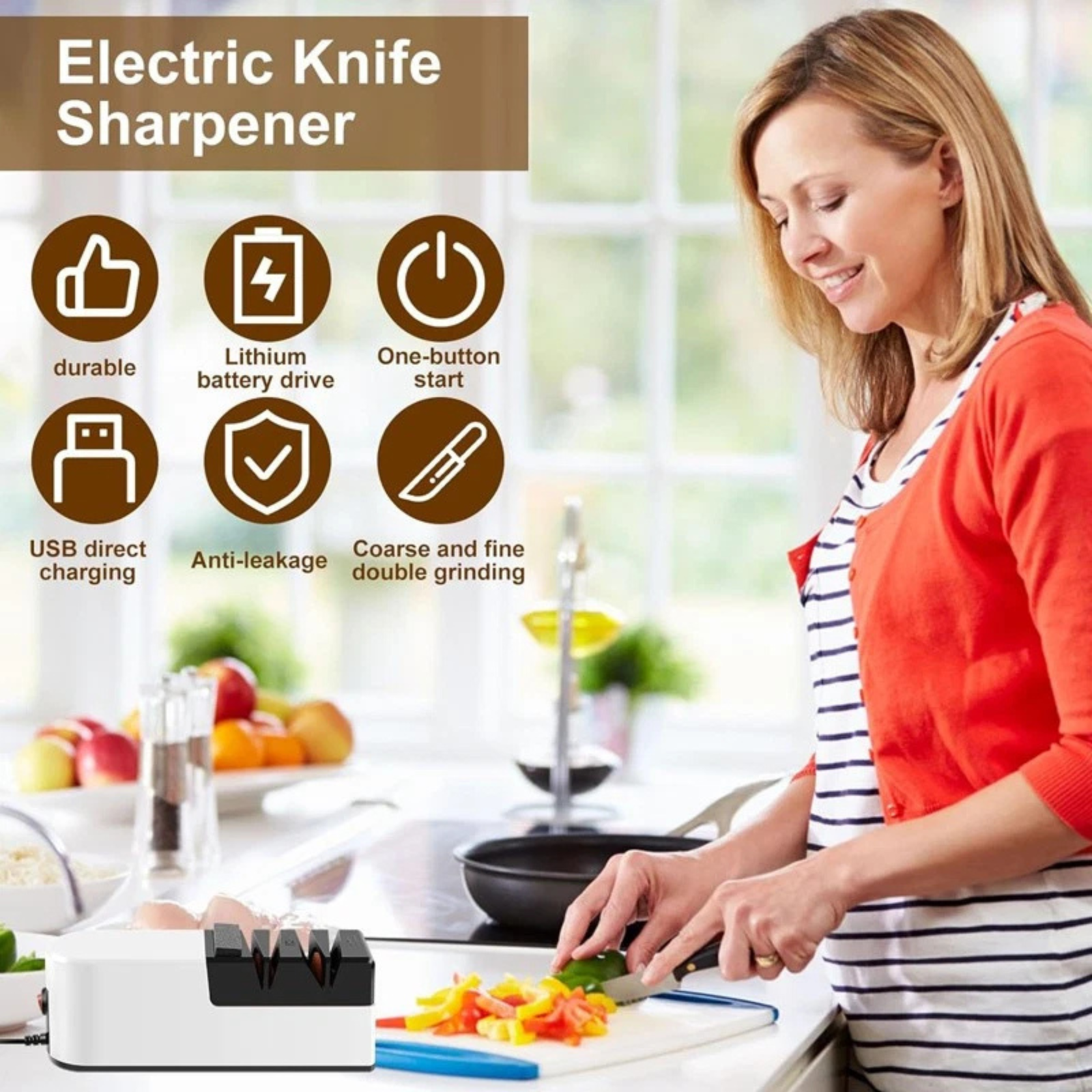 USB RECHARGEABLE ELECTRIC KNIFE SHARPENER: Restore dull blades with ease using this compact and powerful electric sharpener. Featuring dual-speed control, rechargeable lithium battery, and durable grinding wheels, it’s perfect for keeping your metal knives razor sharp at home or on the go.
