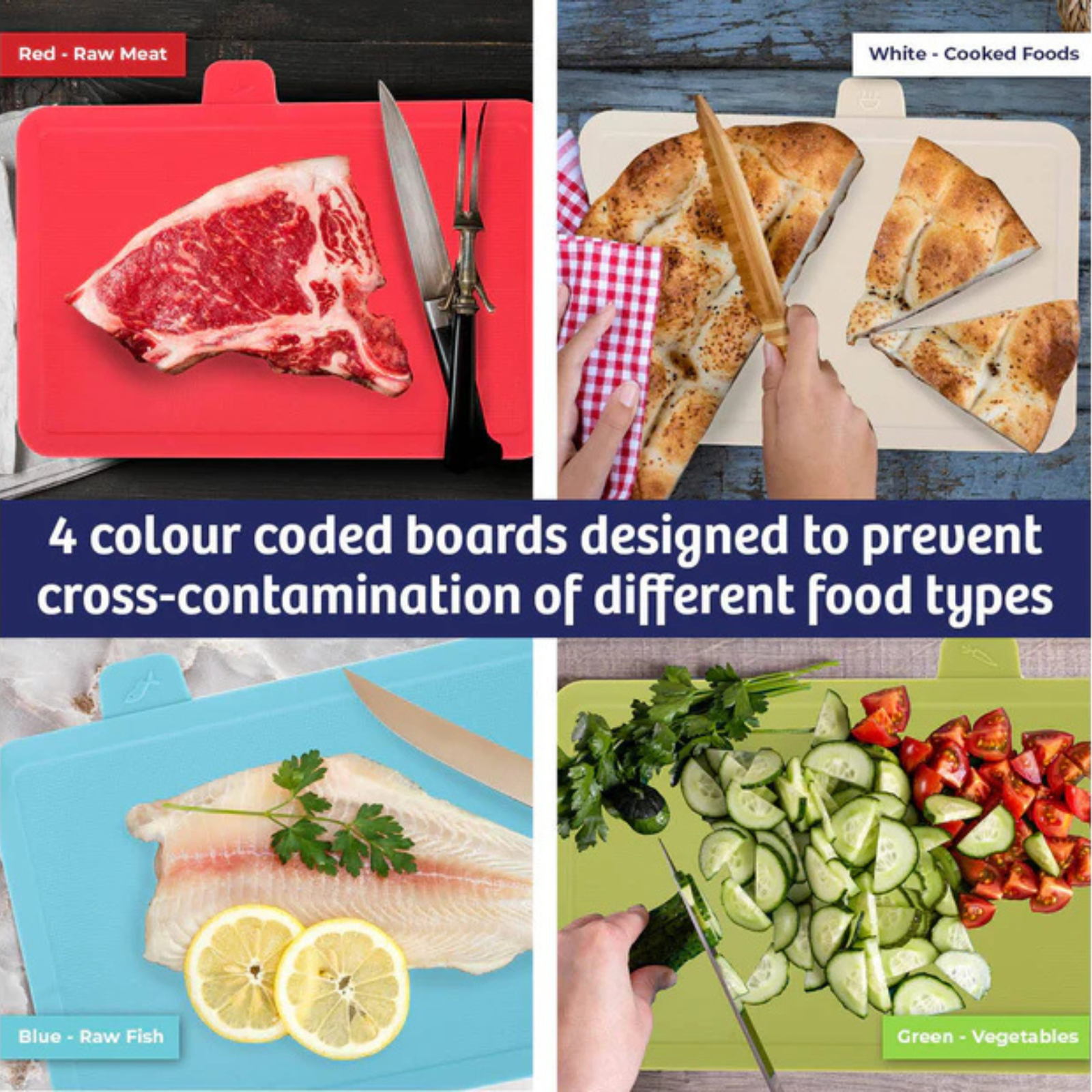 Upgrade your kitchen with this set of 4 plastic cutting boards, featuring index tabs for specific food types raw meat, raw fish, vegetables, and cooked food. This innovative design prevents cross-contamination, ensuring a safer cooking environment. Easy to clean.