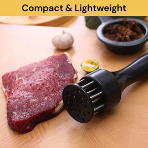 Elevate your culinary game with the meat tenderizer. Its stainless-steel prongs break down tough fibers, enhancing taste and tenderness. Made from premium food grade stainless steel, it ensures fast and thorough marinating. Safety lock and storage cap provide peace of mind.