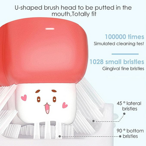 Revolutionary U-shaped design ensures easy, effective baby teeth cleaning. Gentle U-shaped toothbrush. Soft silicone brush head offers quiet, bleeding-free massages. Clean teeth, healthy baby, enhanced independence. Kid-friendly with food-grade bristles, ergonomic handle. Elevate oral care confidently.