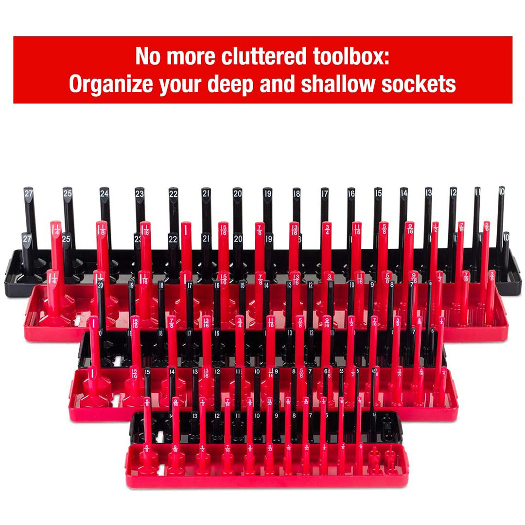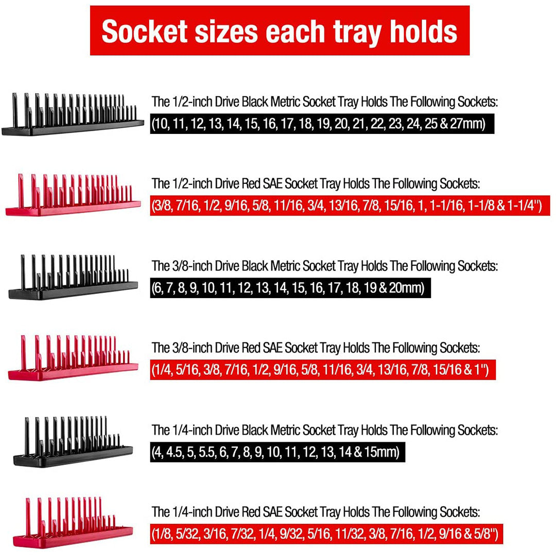• Red & Black Trays: Red for SAE and black for Metric sockets for easy distinction.