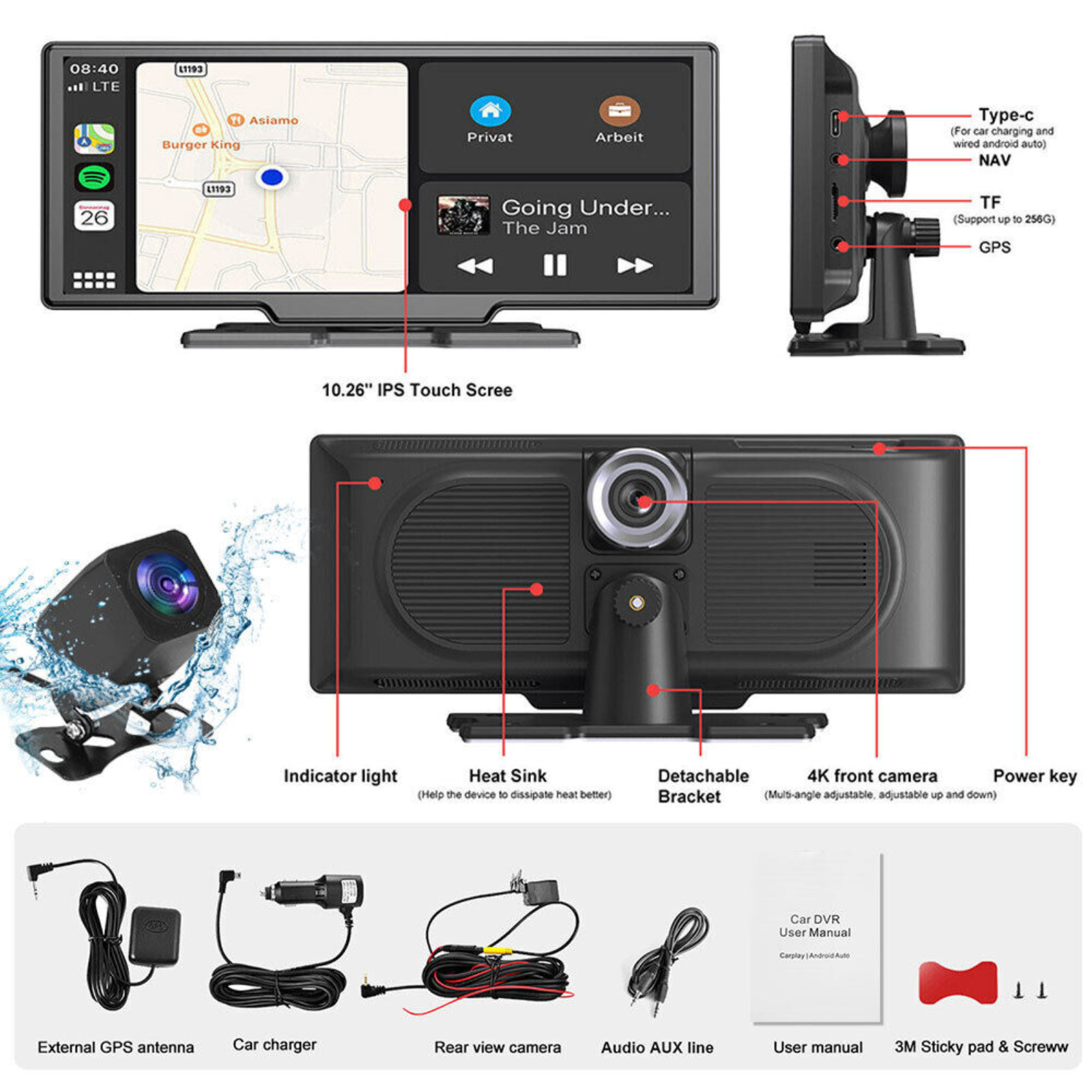 Car Play Video Recorder Touch Screen 4K 10.26" Dual Dash Camera UHD 4K WIFI GPS
