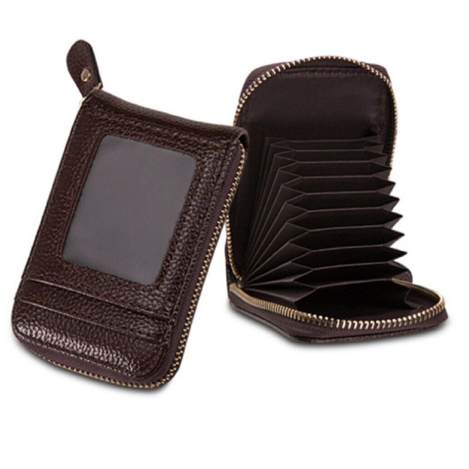 Ample Storage: 9 credit card slots, 2 cash slots, clear ID window, zipper pocket.