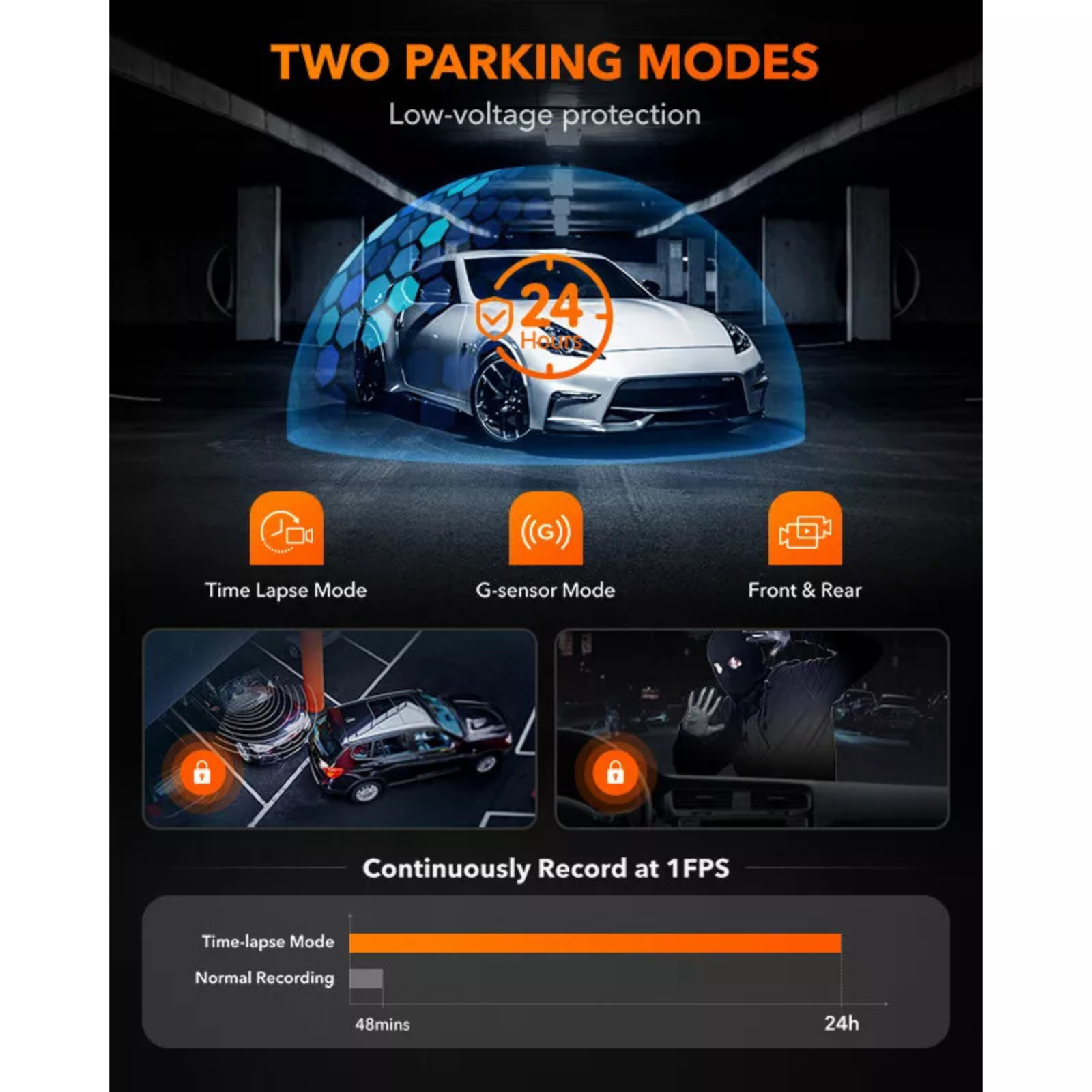 • 24H Dual-Cam Parking Monitor: Monitors surroundings with time-lapse or impact mode when hardwired.