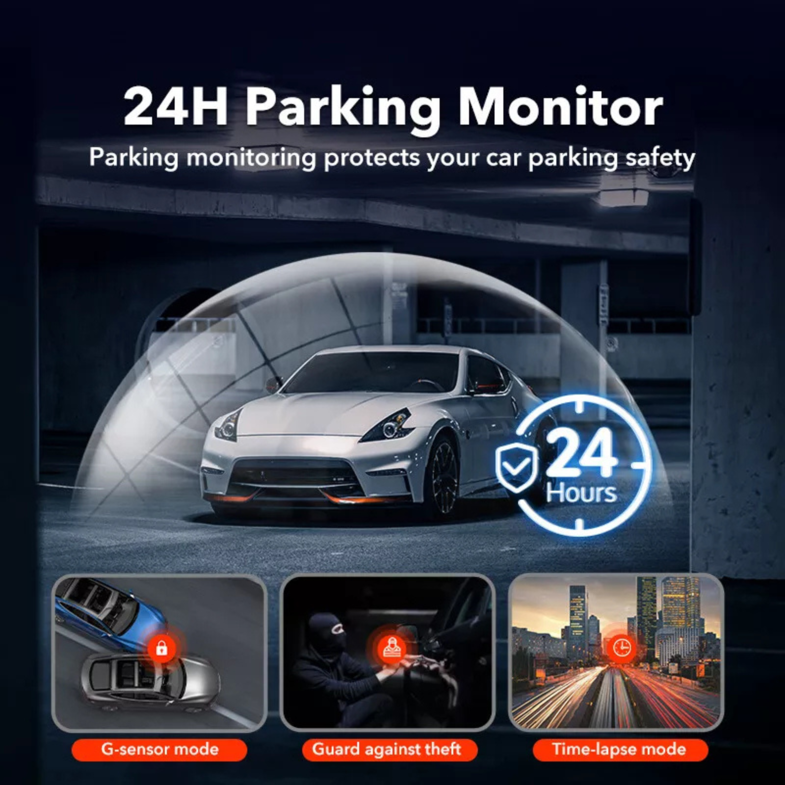 24H Parking Monitor with G-Sensor: Records incidents while parked and locks footage for safety with hardwire kit support.