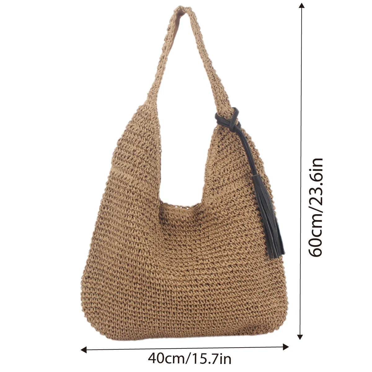 STYLISH & SPACIOUS: This Large Capacity Tote Straw Shoulder Bag is perfect for everyday use or beachside outings, handwoven from durable straw material. Features a magnetic buckle for secure closure and a chic tassel accent for added flair.