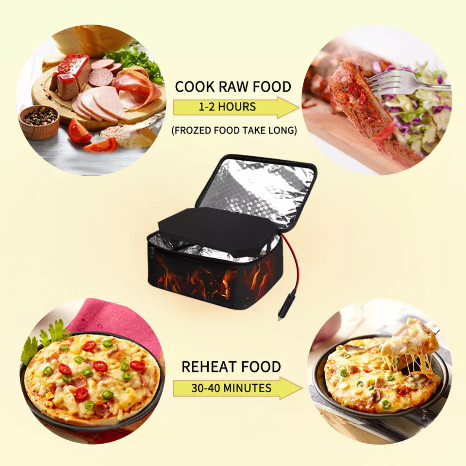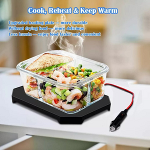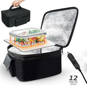 12V PORTABLE MINI OVEN: Enjoy hot, home-cooked meals on the go with this plug-in heating lunch bag, perfect for work, travel, camping or anywhere with a cigarette lighter outlet. Compact, efficient, and mess-free.