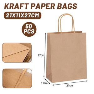 Elevate gifts with the Kraft Brown Craft Bags! 100% Recycled Paper, sturdy handles, and solid design. Versatile for gifts, favors, takeaway, and shopping. Size: 272111cm, 50pcs. Make a statement with personalized, eco-friendly style!