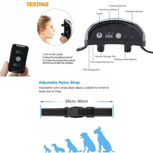 Introducing the Auto Anti Bark Dog Collar: Train pets effortlessly. No shock, no pain. This humane & waterproof collar uses safe sound & vibration stimulus to stop barking. Intelligent recognition & adjustable sensitivity levels provide effective training. Rechargeable for convenience. Say goodbye to excessive barking with this non-shock collar.