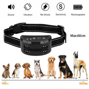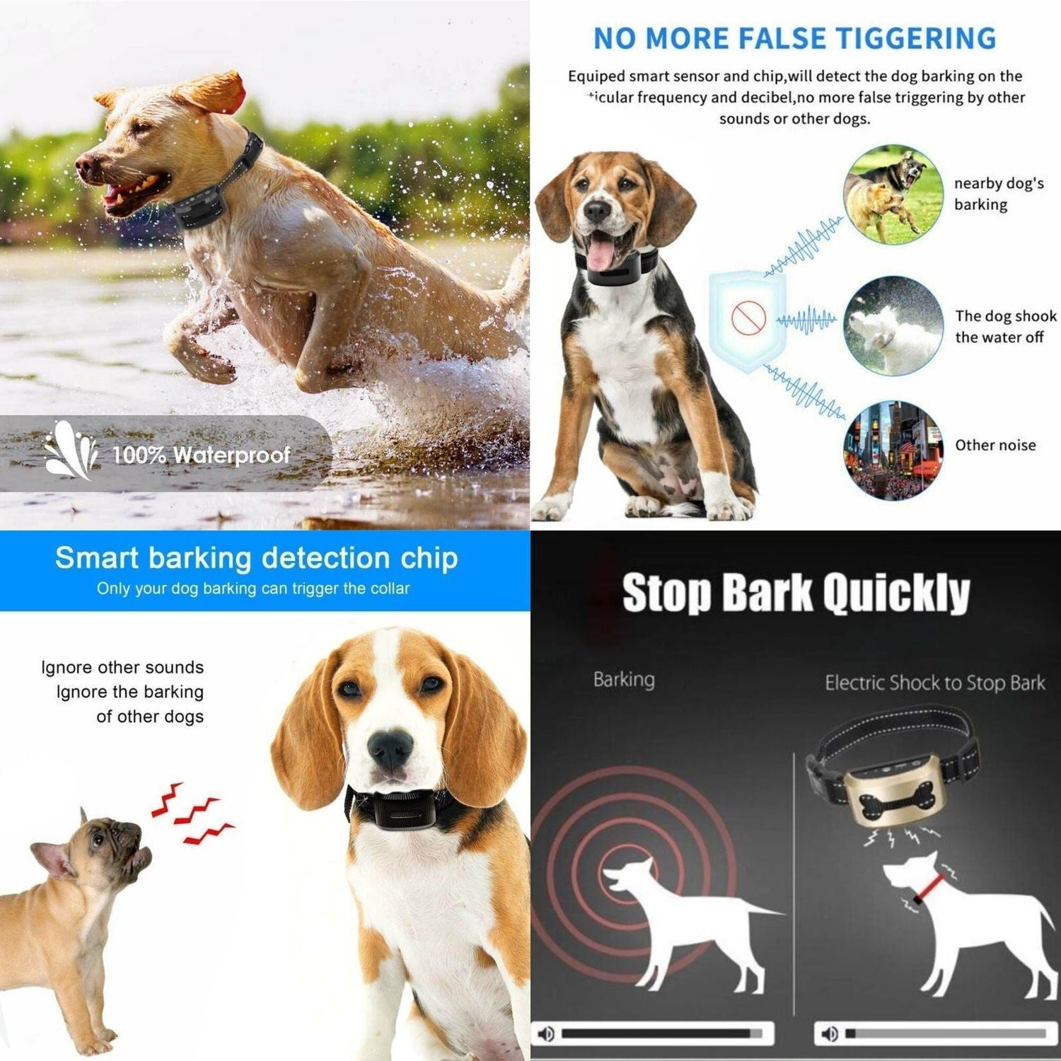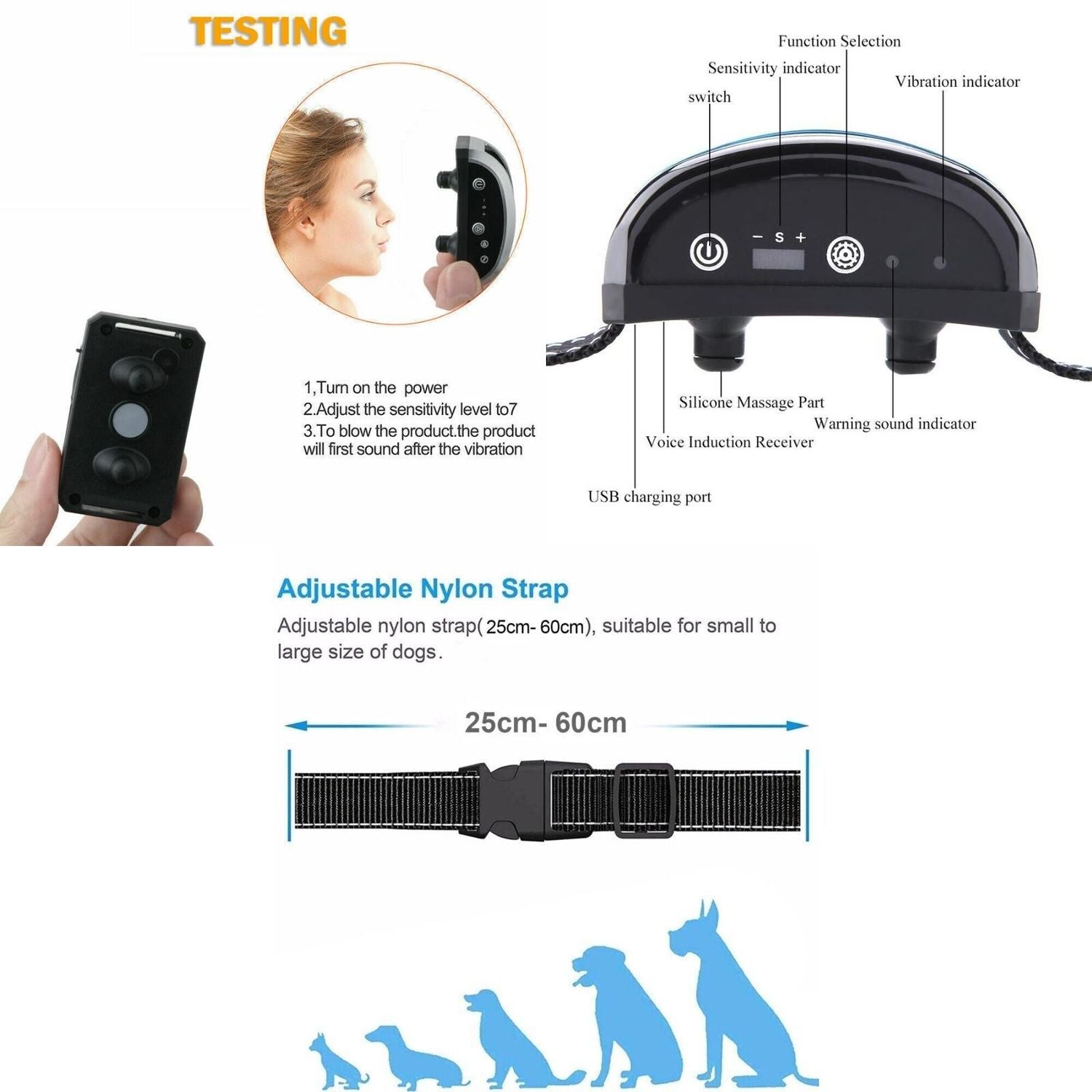 Introducing the Auto Anti Bark Dog Collar: Train pets effortlessly. No shock, no pain. This humane & waterproof collar uses safe sound & vibration stimulus to stop barking. Intelligent recognition & adjustable sensitivity levels provide effective training. Rechargeable for convenience. Say goodbye to excessive barking with this non-shock collar.