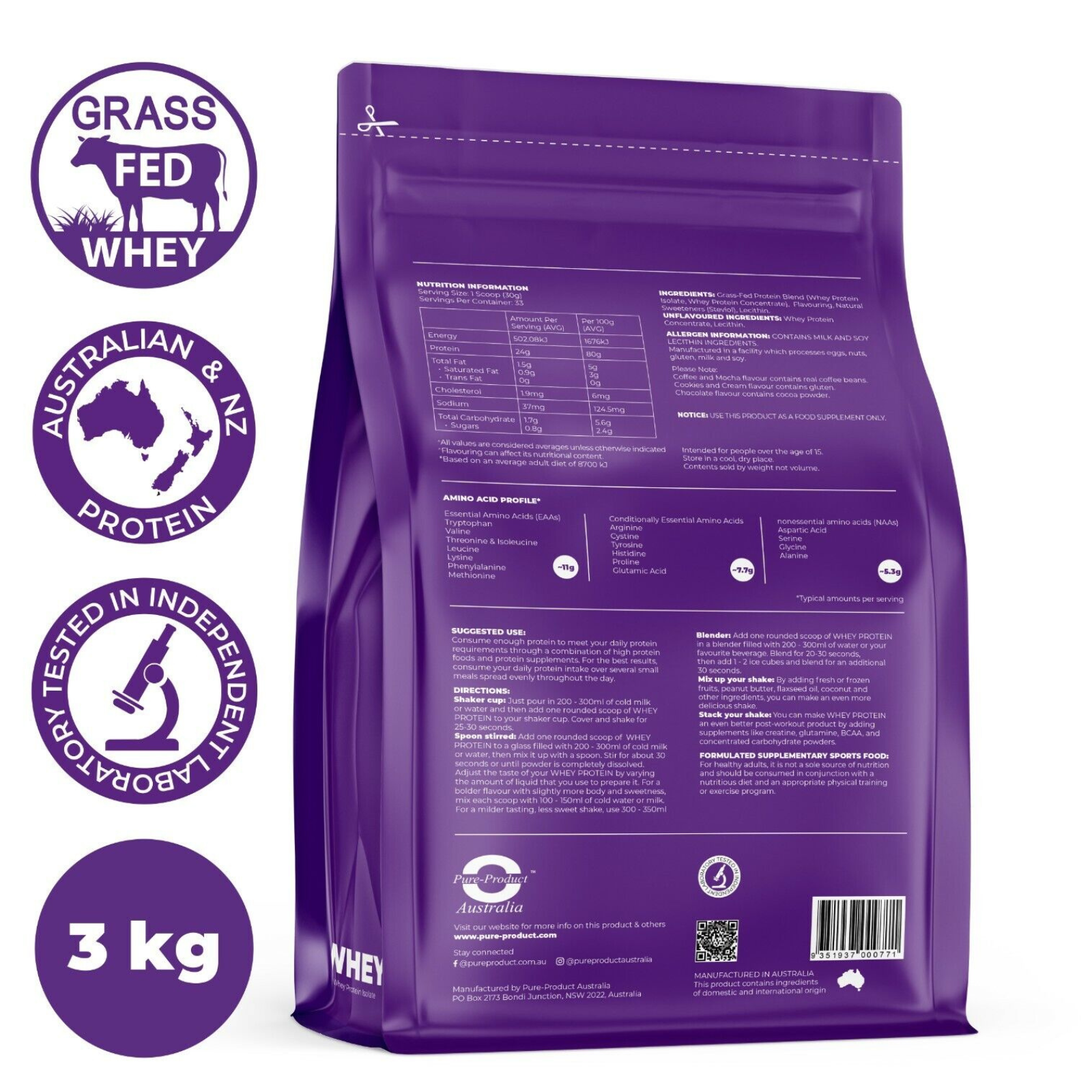 - Ingredients: Grass-fed Protein Blend (Whey Isolate, Whey Concentrate), Flavouring, Natural Sweeteners (steviol), Lecithin.